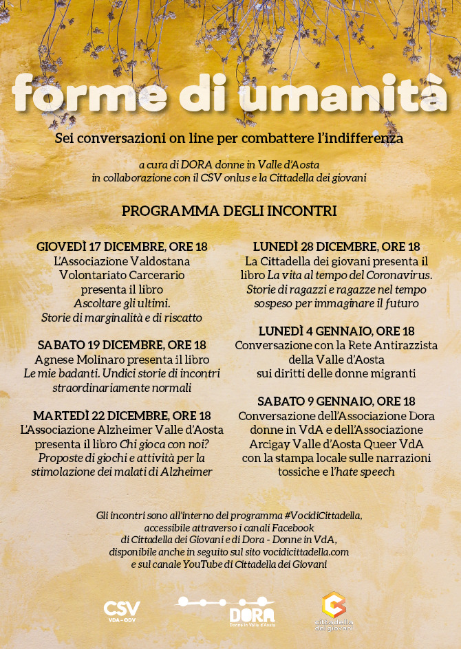 Ieri, giovedì 17 dicembre, si è svolto il primo incontro della rassegna di conversazioni online Forme di umanità, organizzata dall’associazione DORA donne in Valle d’Aosta, in collaborazione con il CSV onlus e la Cittadella dei Giovani.