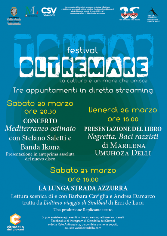 I tre appuntamenti di musica, letteratura e teatro si svolgeranno online sui canali Facebook, Youtube e Vimeo di Cittadella dei Giovani e Rete Antirazzista VdA. Si parte sabato 20 marzo alle 20.30 con Stefano Saletti e Banda Ikona ed il loro concerto “Mediterraneo ostinato”, durante il quale presenteranno in anteprima assoluta il nuovo disco in uscita questo mese. Con Stefano Saletti (voce, oud, bouzouki, chitarra), ci saranno Barbara Eramo (voce, ukulele), Gabriele Coen (clarinetto, sax soprano), Mario Rivera (basso acustico) e Giovanni Lo Cascio (drums set, percussioni).