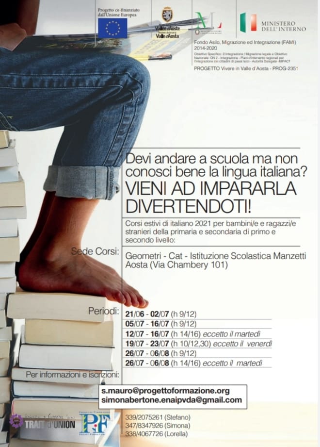 L’iniziativa è organizzata da Consorzio Trait d’Union e Progetto Formazione nell’ambito del progetto Vivere in Valle d’Aosta, a valere sul Fondo Asilo, Migrazione e Integrazione (FAMI 2014-2020).