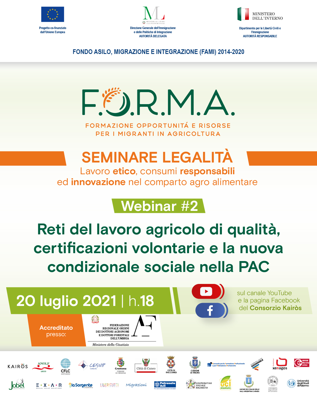 Il WEBINAR #2, dal titolo “Reti del lavoro agricolo di qualità, certificazioni volontarie e la nuova condizionale sociale nella PAC” potrà essere seguito sulla pagina Facebook e il canale YouTube del Consorzio Kairòs.