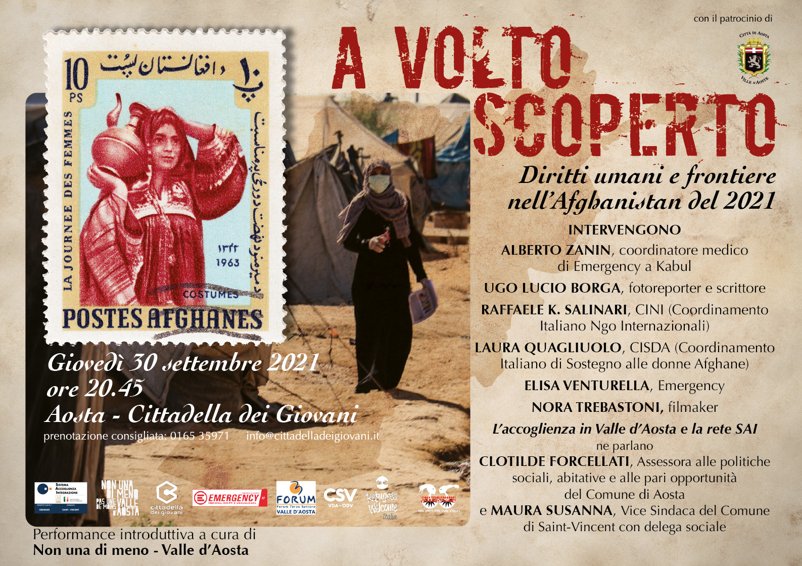 Giovedì 30 settembre 2021 alle ore 20.45 nel Teatro della Cittadella di Aosta si terrà l’iniziativa A volto scoperto, diritti umani e frontiere nell’Afghanistan del 2021, organizzata dal Consorzio Trait d’Union, nell’ambito del progetto SAI – Sistema di Accoglienza e Integrazione, e dal collettivo Non Una di Meno Valle d’Aosta in collaborazione con Cittadella dei Giovani, Emergency Gruppo di Aosta, Forum del Terzo Settore Valle d’Aosta, CSV VdA, Refugees Welcome Italia – gruppo territoriale di Aosta, Rete Antirazzista Valle d’Aosta e con il patrocinio del Comune di Aosta.
