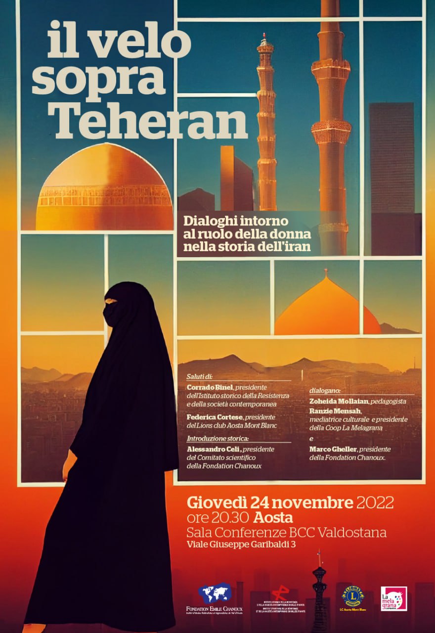 Giovedì 24 novembre 2022 alle ore 20.30 presso la Sala Conferenze della BCC Valdostana di Aosta (Viale Giuseppe Garibaldi, 3), si terrà l’evento Il velo sopra Teheran – Dialoghi intorno al ruolo della donna nella storia dell’Iran organizzato dalla Fondation Emile Chanoux in collaborazione con l’Istituto Storico della Resistenza e della Società Contemporanea in Valle d’Aosta, il Lions Club Aosta Mont Blanc e la cooperativa sociale La Melagrana.